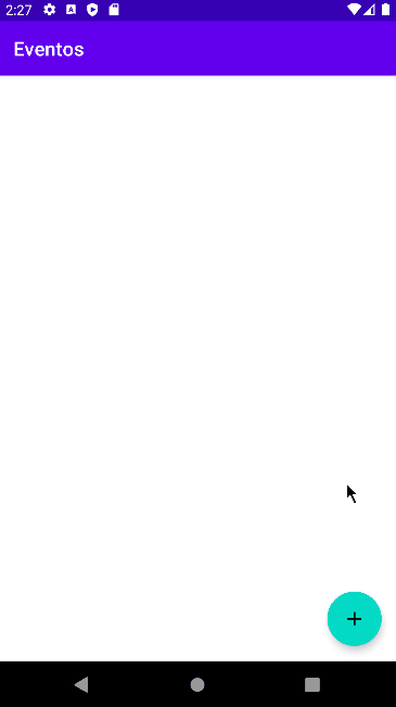 Na implementação do App, temos um RecyclerView que apresenta cada evento cadastrado. Para cadastrar o evento, clicamos no FAB (FloatingActionButton), preenchemos o formulário com título e data e clicamos em Salvar.